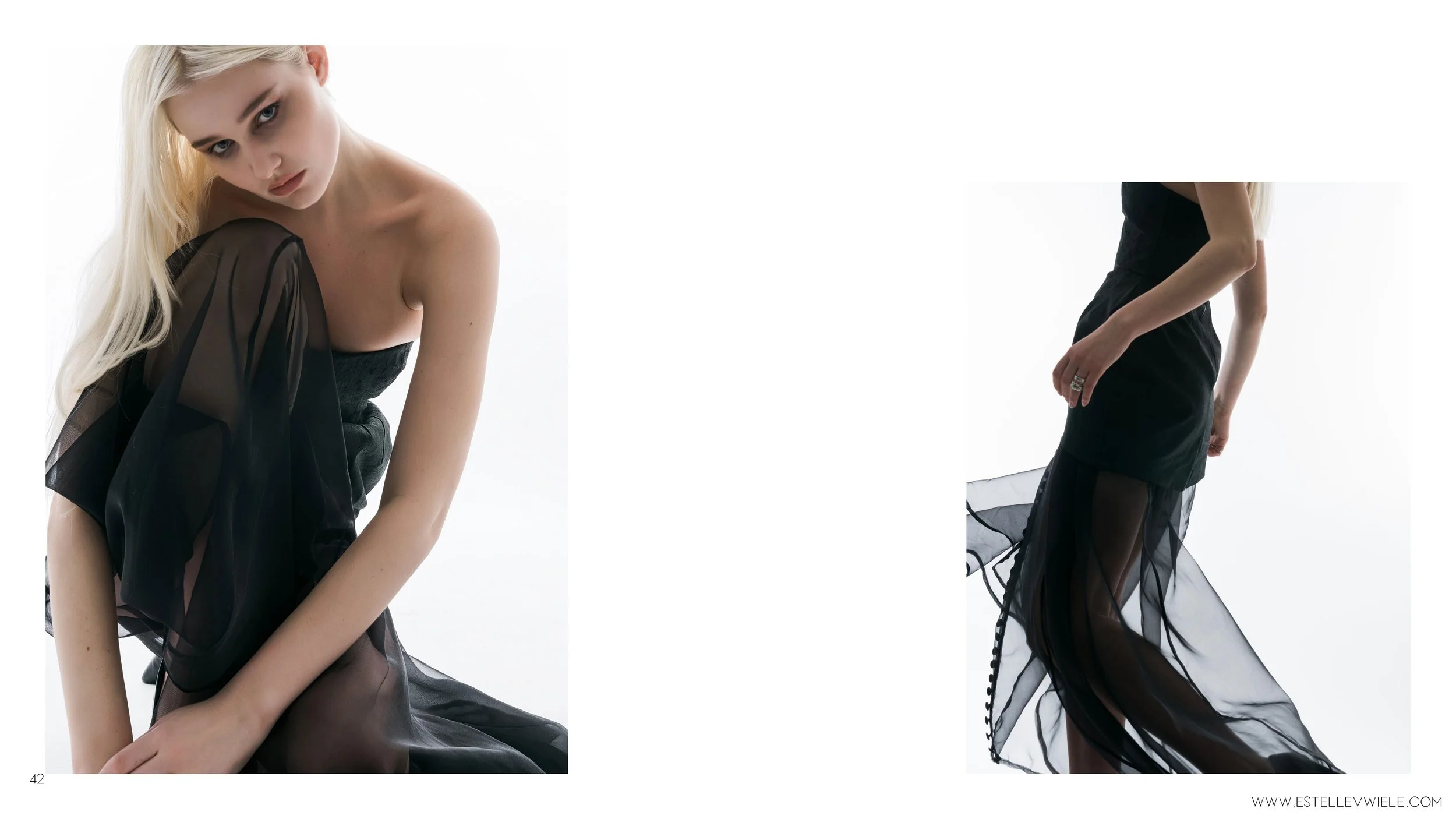 BY COMBINING SUCH CONTRASTS, “DICHOTOMIES”, I HAVE DEVELOPED A COllECTION THAT REFLECTS A MODERN AND EDGY INTERPRETATION OF COUTURE GARMENTS. THE COllECTION ADOPTS SEVERAL COUTURE TECHNIQUES STUDIED THROUGH ARCHIVES, FOCUSING PRIMARILY ON CRISTOBAL BALENCIAGA FROM THE 1950S. THESE INCLUDE BONING, HORSEHAIR HEMS, HAND EMBROIDERY, TAILORING-TECHNIQUES AND HAND-FINISHES. All OF THESE DELIBERATE CHOICES CREATE A UNIQUE FUSION OF OLD-WORLD ELEGANCE AND CONTEMPORARY FASHION, EMBRACING THE BEAUTY OF THE DARK, AS WEll AS THE CLASSIC. THIS COllECTION IS FOR THE WOMAN WHO IS UNAPOLOGETICAllY HERSELF, EMBRACES HER INDIVIDUALITY WHILE HONOURING CRAFTSMANSHIP.